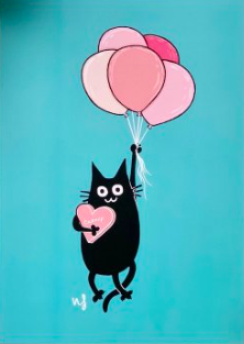 Postikortti Wilhelmiina & Mustakissa Design - Kissa ja ilmapallot